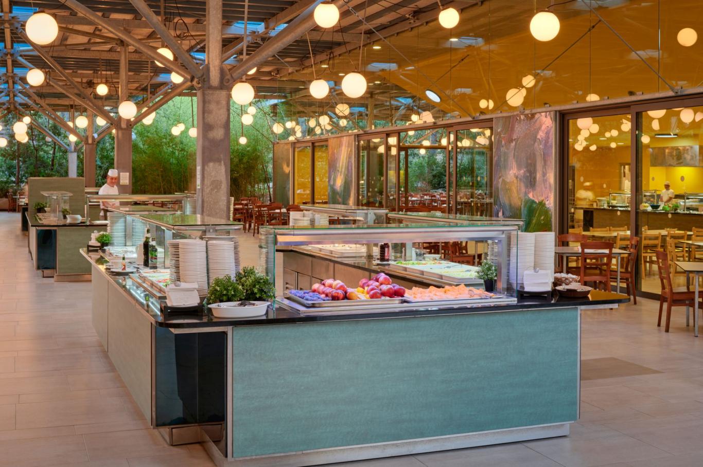 Dans notre buffet vous pouvez trouver principalement la cuisine méditerranéenne, aux fruits de mer, viandes, pâtes, légumes, salades et fruits. La bière, les jus de fruits et le vin, dont vous pouvez vous servir pendant les repas, sont également inclus dans notre service "tout compris". Le petit-déjeuner est servi de 7:15-10:00, le déjeuner de 12:30-14:30 et le dîner de 19:15-21:00.