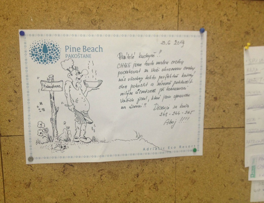Koliko je značajno mjesto restorana u povijesti naselja i životima naših djelatnika govori i činjenica da je za “kulisu” tradicionalne grupne fotografije svih naših zaposlenika, kao svojevrsni pozdrav od sezone 2014. odabrano upravo mjesto ispred starog restorana uz kojeg su vezane tolike uspomene i iskustva. Često u našem restoranu rade članovi iste obitelji iz Pakoštana i okolice, što je najbolji primjer koliko ovaj objekt, kao i cijelo naselje, živi sa lokalnom zajednicom. A njihov trud ne prolazi nezapaženo! Ove je godine Jere, naš šef kuhinje, tako dobio i posvetu naših gostiju iz Češke za „uslugu sa osmijehom :) i ogroman trud“ u vidu zahvale i crteža na restoranskoj salveti:).