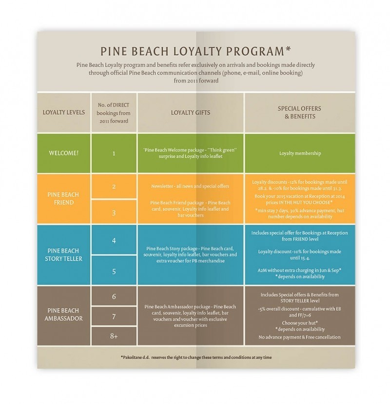 Z uwagi na fakt, że ośrodek przeszedł rebranding tj. od sezonu 2011 r. używa innej nazwy, Program lojalnościowy oparty jest na liczbie bezpośrednich rezerwacji począwszy od 2011 roku. Pojęcie rezerwacja bezpośrednia dotyczy rezerwacji dokonanych przez oficjalne kanały komunikacyjne Pine Beach - telefon, e-mail lub rezerwacje w systemie online. Jeżeli jesteś gościem agencyjnym na pewno zadajesz sobie pytanie dlaczego Twoje rezerwacje nie są rejestrowane w Programie lojalnościowym Pine Beach. Nie martw się, nie jesteś wykluczony Szanujemy zasady współpracy z agencjami i ich prawo do kontaktowania gości, którzy swoich rezerwacji dokonują za pośrednictwem agencji, ale wierzymy, że klienci ci korzystają z profitów agencyjnych programów lojalnościowych. Ale wróćmy do naszego programu lojalnościowego Pine Beach.